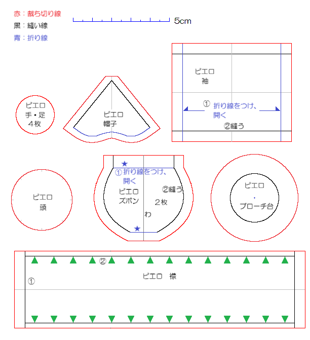 今回は作りやすくするため少し大きくしました。できあがりサイズは帽子の先から足まで約7㎝です。備忘録として今回作った型紙を載せておきます。