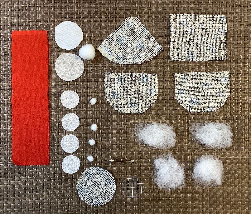 1.頭用芯布(白木綿または白絹)の周囲をぐし縫いし、化繊綿を固く詰めて球を作ります。球の直径は約1.3cmです。