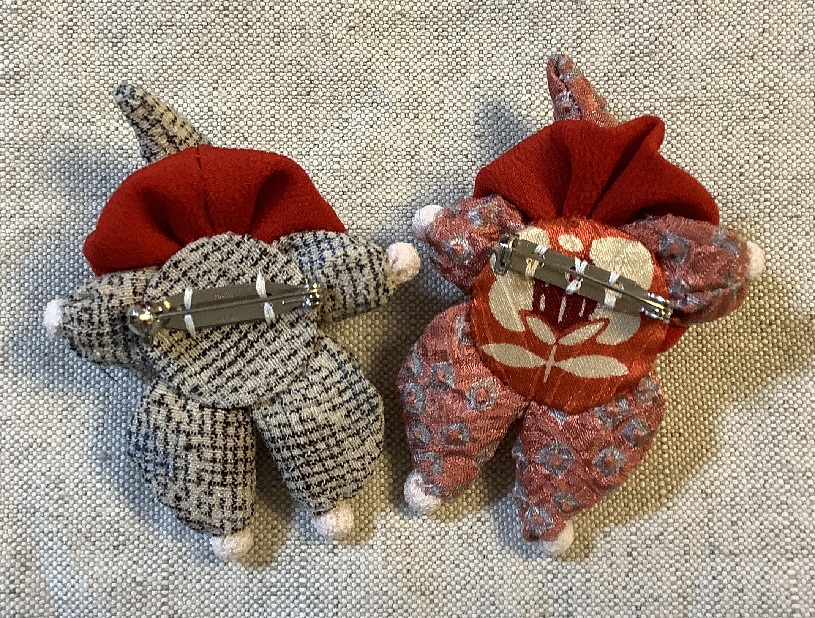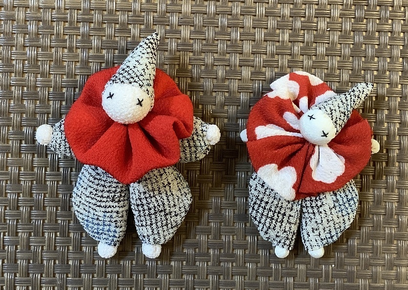 写真右側が以前に作ったもので左側は今回作ったものです。初めは以前作ったものと同じように薄い白絹で頭を作ってみましたが皺ができないようにするのが結構難しいので一越ちりめんを使いました。ちりめんは伸びるのでまず伸びない木綿(または絹)で球を固く作りそれに包んで作りました。