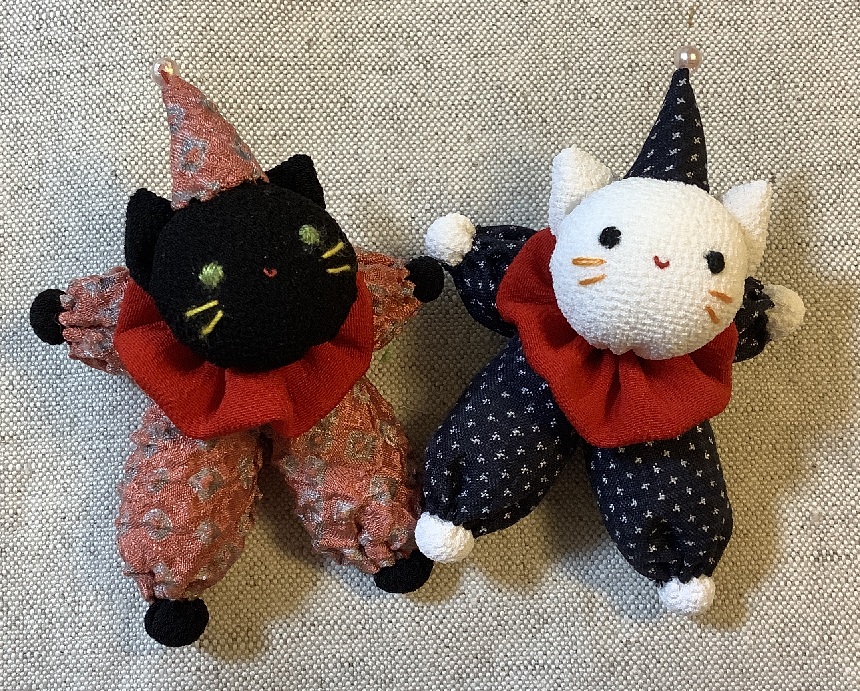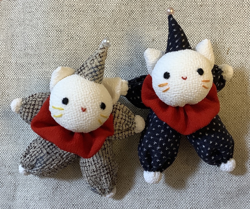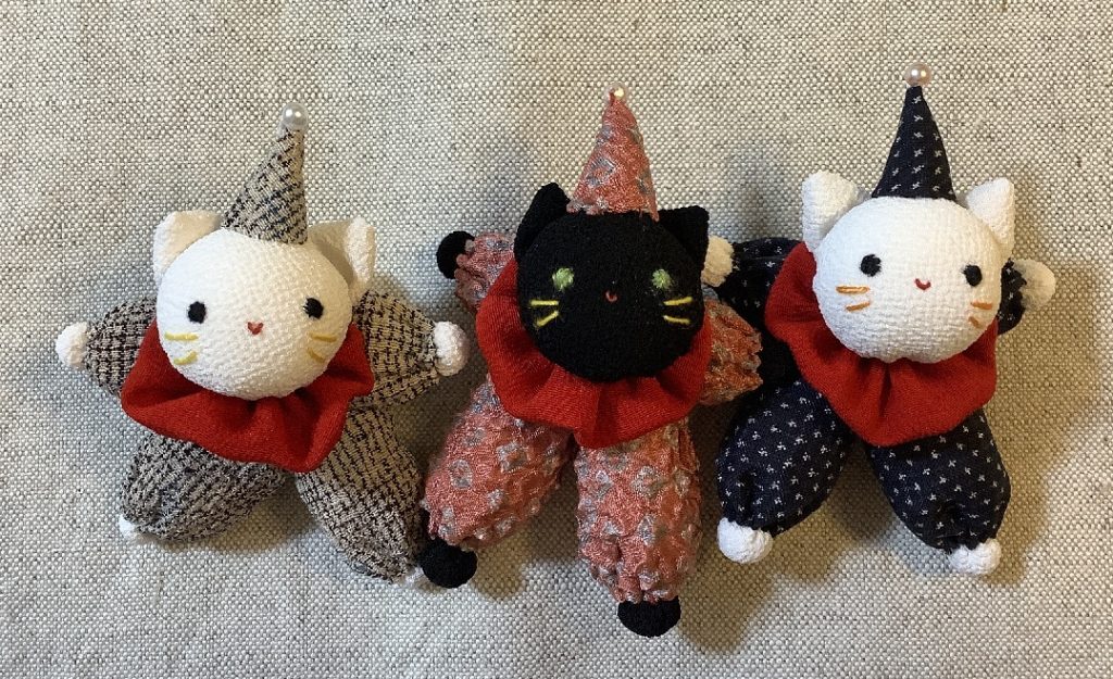 ねこの頭部は以前ご紹介した豆ねこストラップと同じ型紙です。黒猫さんも作ってみました。頭や手足はちりめんを使っていますが作品が小さいので一越ちりめんの方が作りやすいと思います。