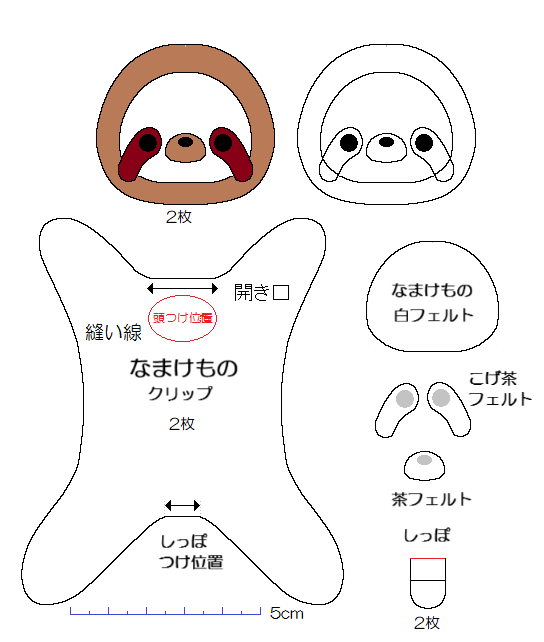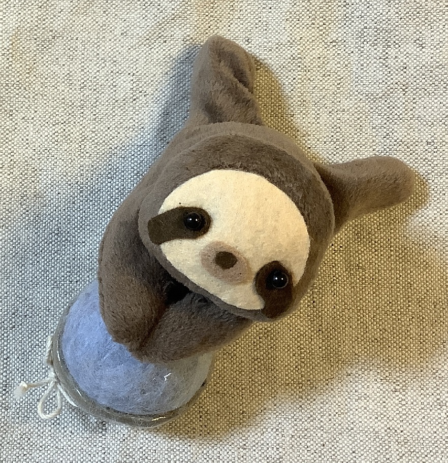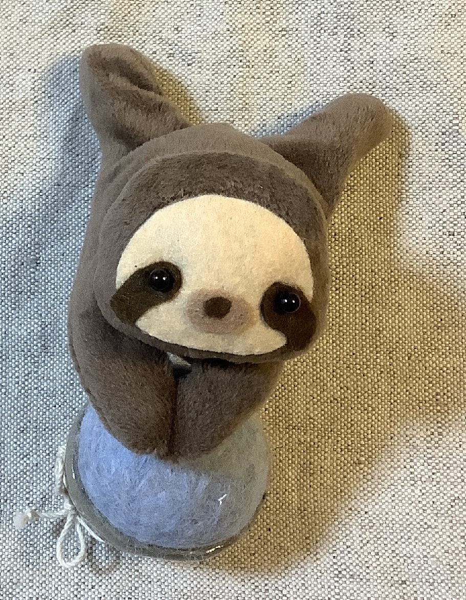 今回はなまけものを作りました。なまけものはミツユビナマケモノとフタユビナマケモノがいるそうですが今回は目の周りの模様が特徴的なミツユビナマケモノを作ってみました。顔の模様はダイソーの両面アイロン接着クロスを使いました。