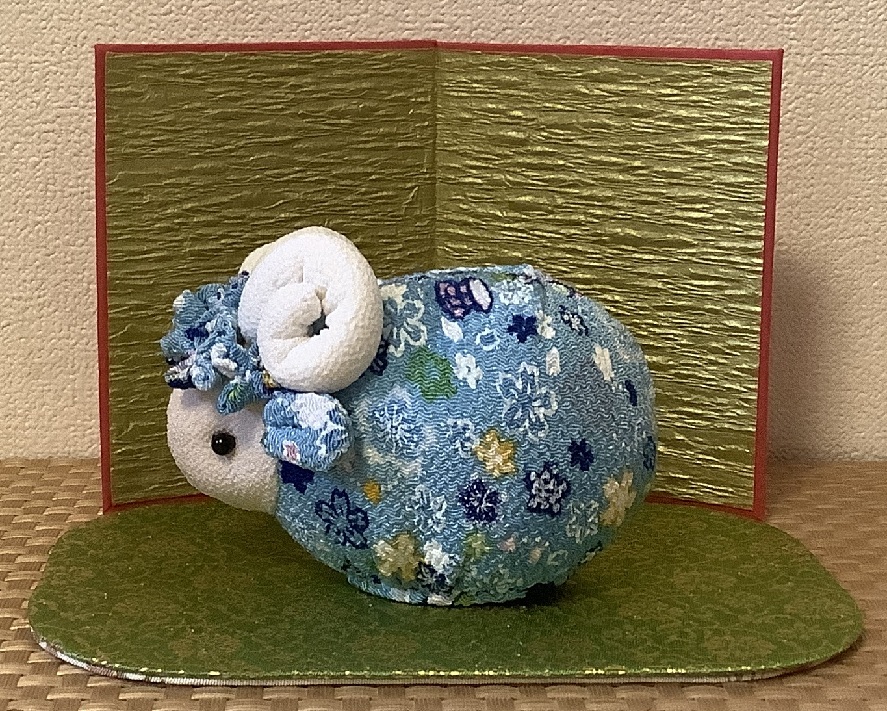 小花で頭のほわほわした感じを出しています。小花は2.5㎝の正方形の縮緬裁ち切りです。動画では少し大きめの布で作り方をご説明しています。