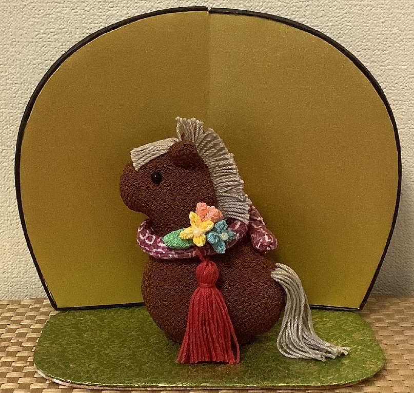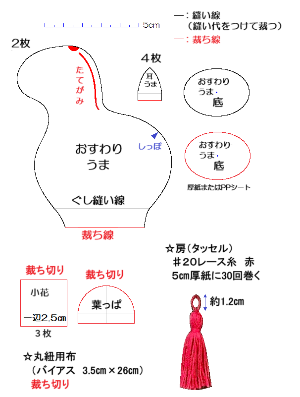 前回ご紹介したおすわりお馬さんの飾りを変えたものになります。丸紐にお花と房飾りをつけました。房に使っている紐はダイソーで購入したローズレッドのレース糸#20です。