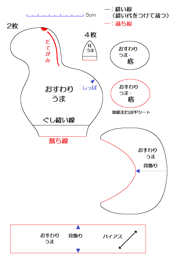 前回に続きお馬さんです。今回のお馬さんはお座りしているお馬で2枚はぎでできているので簡単にできます。鬃髪(まえがみ)、鬣(たてがみ)、尻尾(しっぽ)は前回の作り方と同じです。