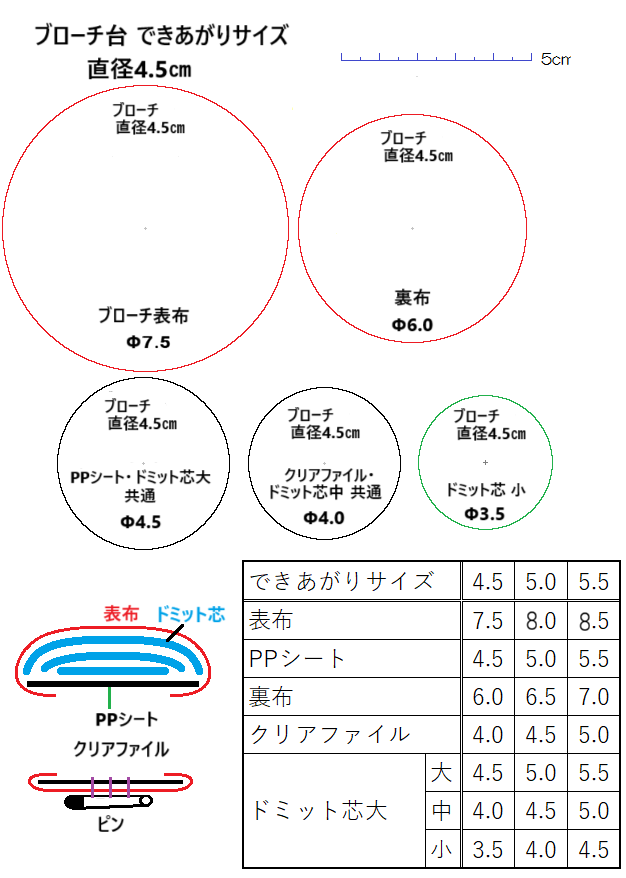 型紙は厚紙でもよいのですが出来上がりサイズ(今回の場合、4.5㎝)と表布用(今回の場合、直径6.5㎝)は透明なもので作った方がよいです。動画の中でもご説明していますが好きな布の一部をブローチにする場合など、透明な方ができあがり範囲を確認することができるためです。