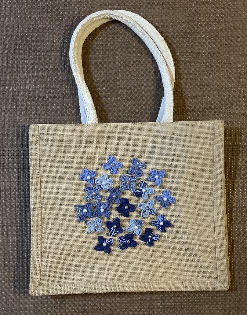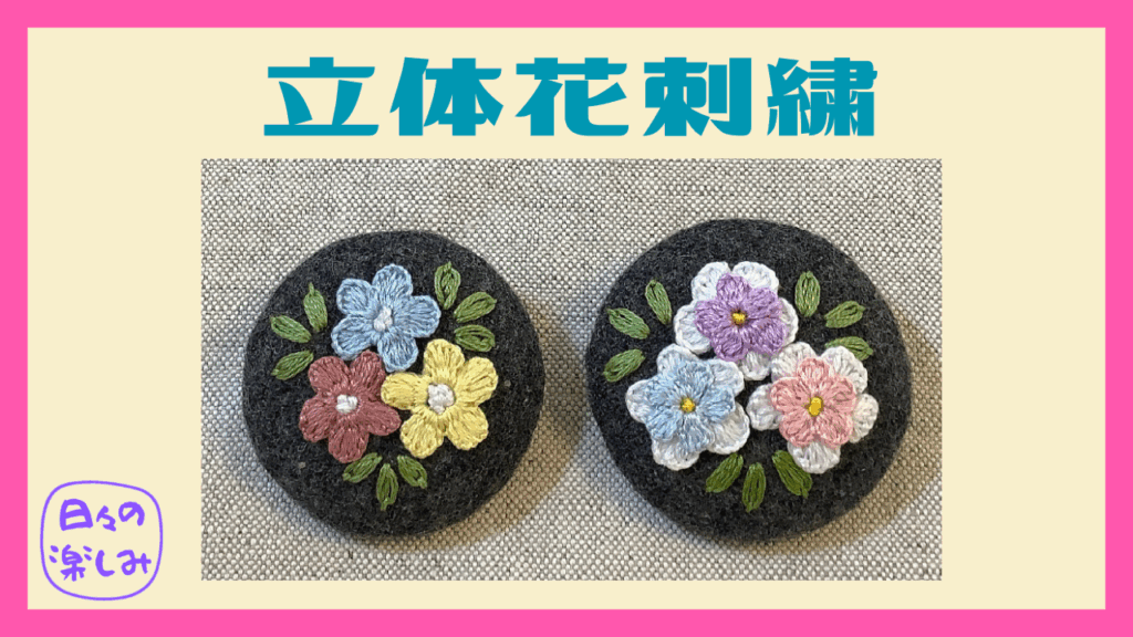 前回、お花の立体刺繍をご紹介しました。今回は刺繍糸の代わりに100円ショップの#20レース糸で作ってみました。お花の中心は6㎜のパールビーズをつけています。こちらも100円ショップで入手できます。