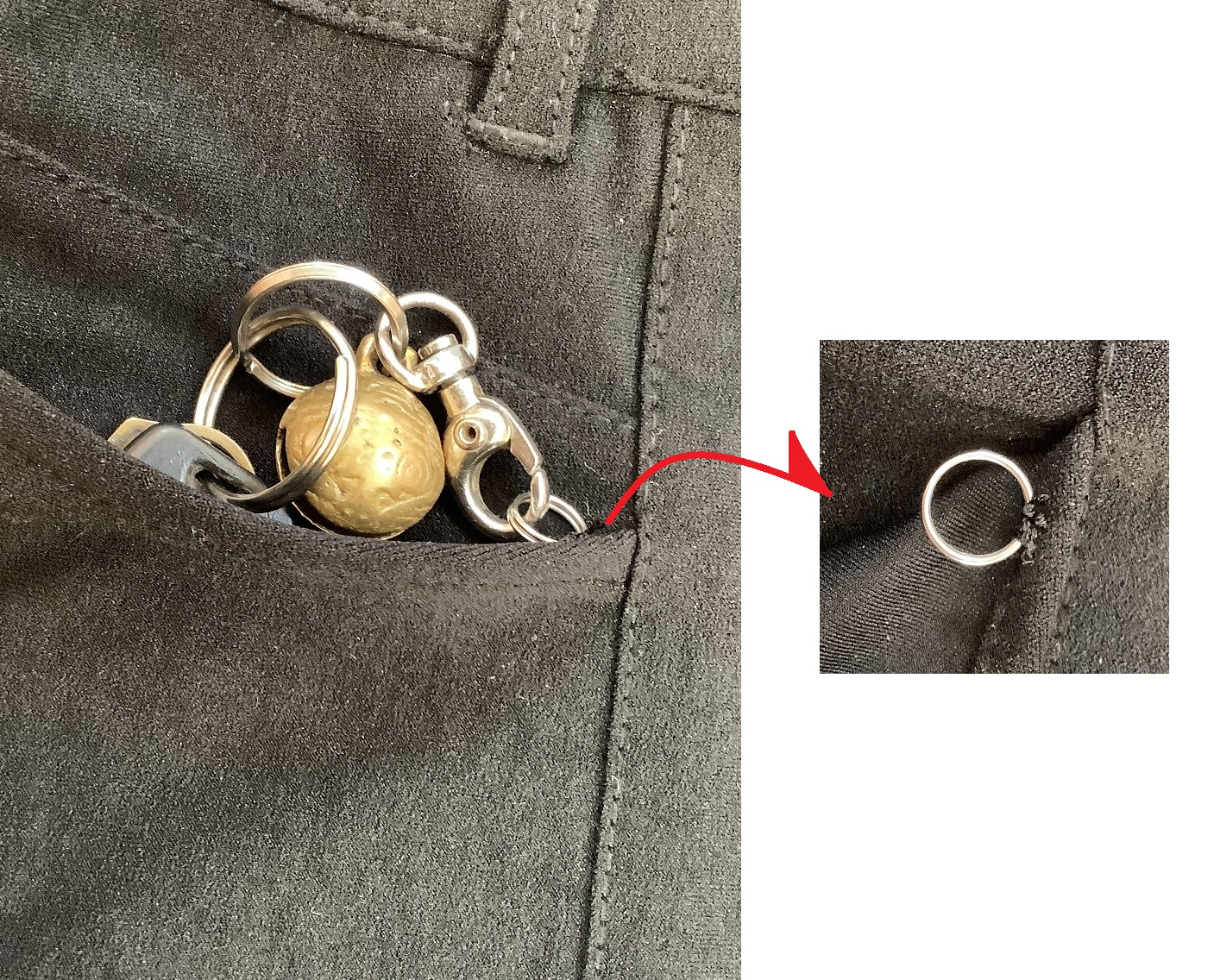 鍵はリュックやバッグにしまえばいいのですがやはり利便性を考えるとズボンのポケットが一番いいのでズボンのポケットに直径1㎝程の二重リングをつけました。二重リングはホームセンターや100円ショップで入手できます。