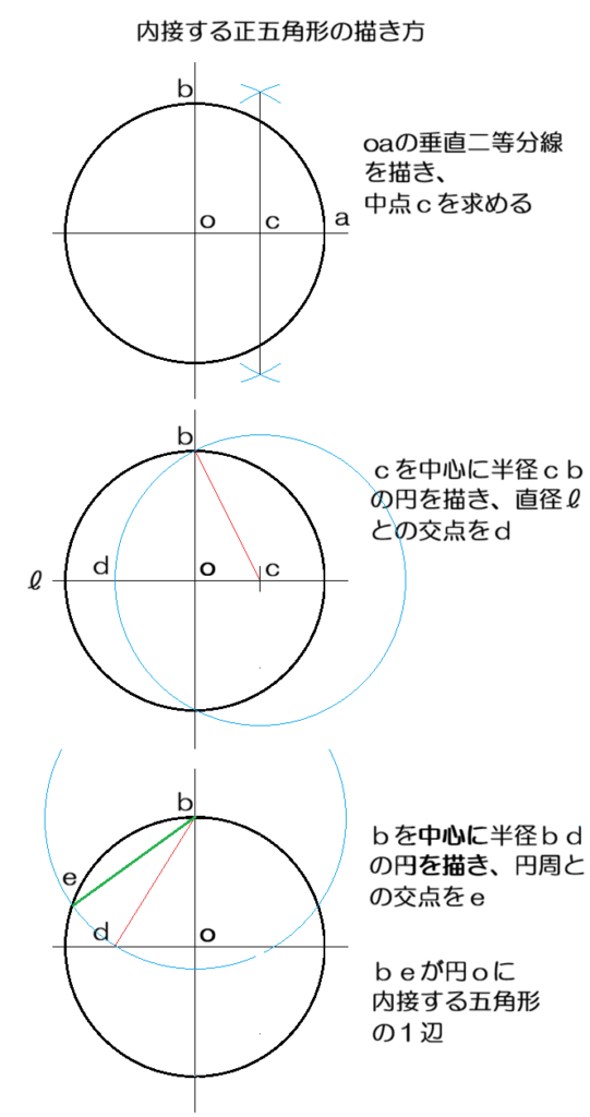 円に内接する六角形の作図は簡単ですが五角形の場合少し複雑になります。以下に説明を書きました。