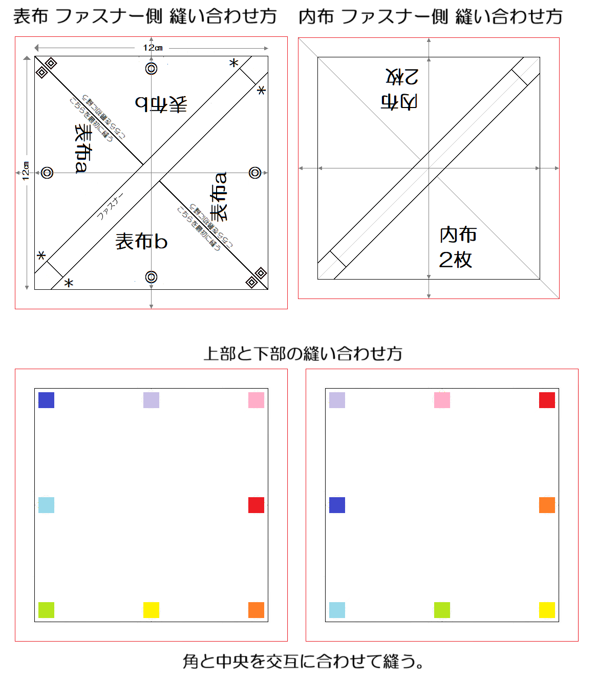 6.内布の上部(直角三角形2枚)と下部(正方形)を各々の辺中心と角を合わせて一周縫います。